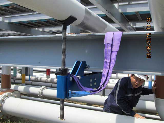 Lifting pipes in pipe racks by means of the Pipe Rack Jack is very easy and safe, just by mounting the PRJ at the bottom of the beam that is supporting the pipe and pushing the pipe upwards.